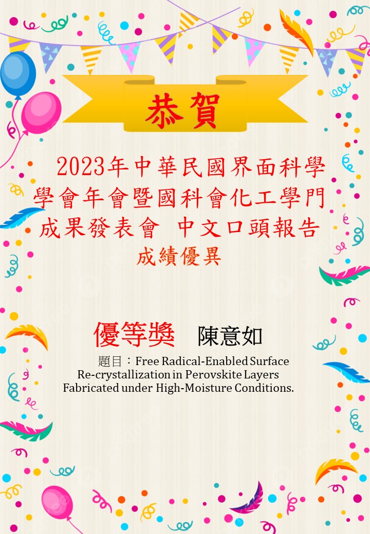 2023-07-19 賀! 2023年中華民國界面科學學會年會暨國科會化工學門成果發表會 中文口頭報告榮獲佳績