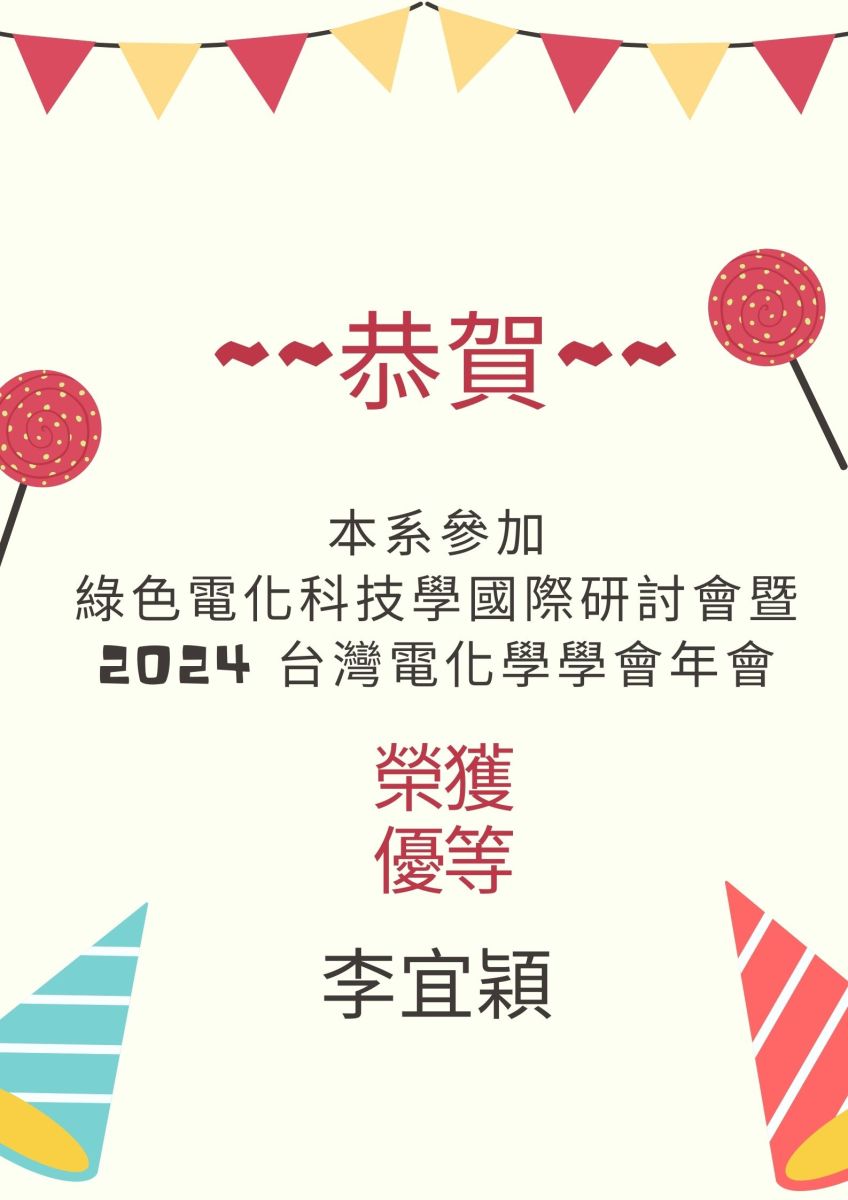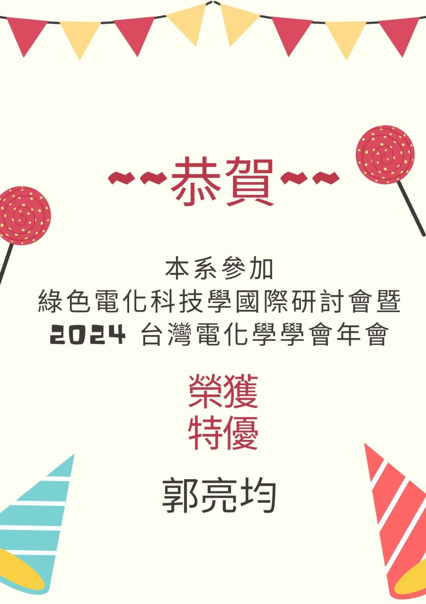 2024-11-20 恭喜~本系參加綠色電化科技學國際研討會暨 2024台灣電化學學會年會李宜穎獲優等、郭亮均獲特優
