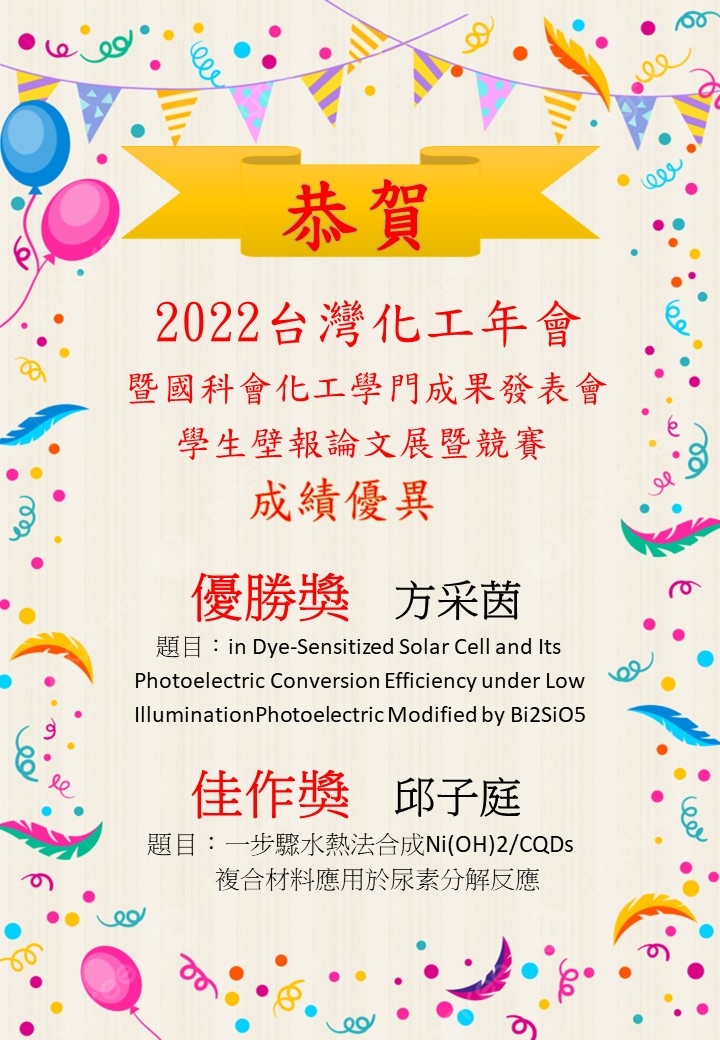 2022-12-12 恭賀~本系學生 2022台灣化工年會暨國科會化工學門成果發表會 學生壁報論文展暨競賽 成績優異